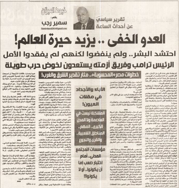 سمير رجب يكتب مقاله " خيوط الميزان " بجريدة الجمهورية بعنوان " العدو الخفي.. يزيد حيرة العالم! "