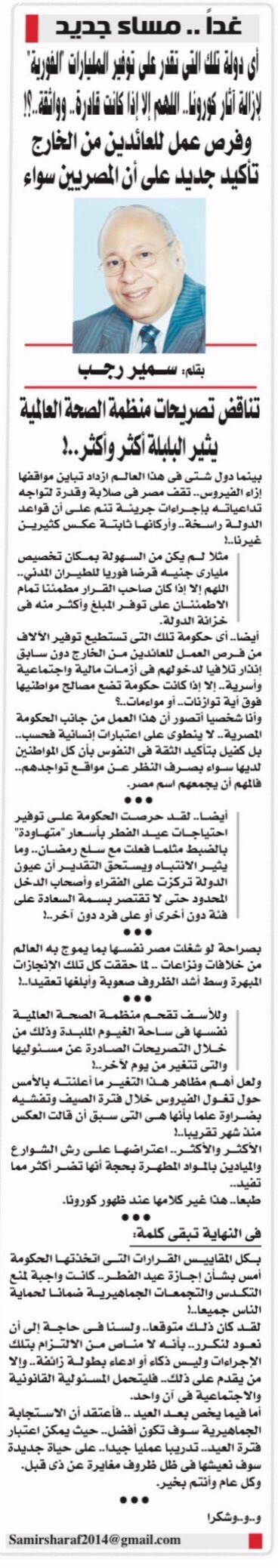 مقال سمير رجب " غدا مساء جديد " بجريدة المساء