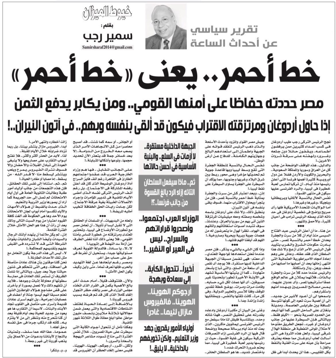 من هنا.. ما أن أعلن الرئيس عبد الفتاح السيسي منذ أيام أن كلاًمن سرت والجفرة يعدان خطا أحمر بالنسبة لمصر.. حتى بادرت حكومات الشرق والغرب بتأييد قول الرئيس الأمر الذي أزعج ولا شك هذا السلطان الذي فقد عقله.. وعاش على وهم إعادة أمجاد الإمبراطورية العثمانية التي انتهى زمانها بعد أن أصابها ما أصابها من ضعف ووهن.. وذل واستكانة.