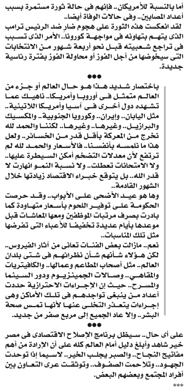 باختصار شديد هذا هو حال العالم أو جزء من العالم متمثل في أوروبا وأمريكا.. ناهيك عما تشهده دول أخرى في آسيا وأمريكا اللاتينية .. مثل اليابان.. وإيران.. وكورويا الجنوبية.. والمكسيك والبرازيل.. وغيرها.. وغيرها.. لكننا والحمد لله نخرج من المعركة بأقل قدر من الخسائر.. ولعل هذا ما نلمسه بأنفسنا.. فالأسعار والحمد لله لم ترتفع لأن معدلات التضخم أمكن السيطرة عليها.. ولا الامتحانات تعطلت.. ولا نسبة النمو انهارت لا قدر الله.. بل يتوقع خبراء الاقتصاد زيادتها خلال الشهور القادمة..