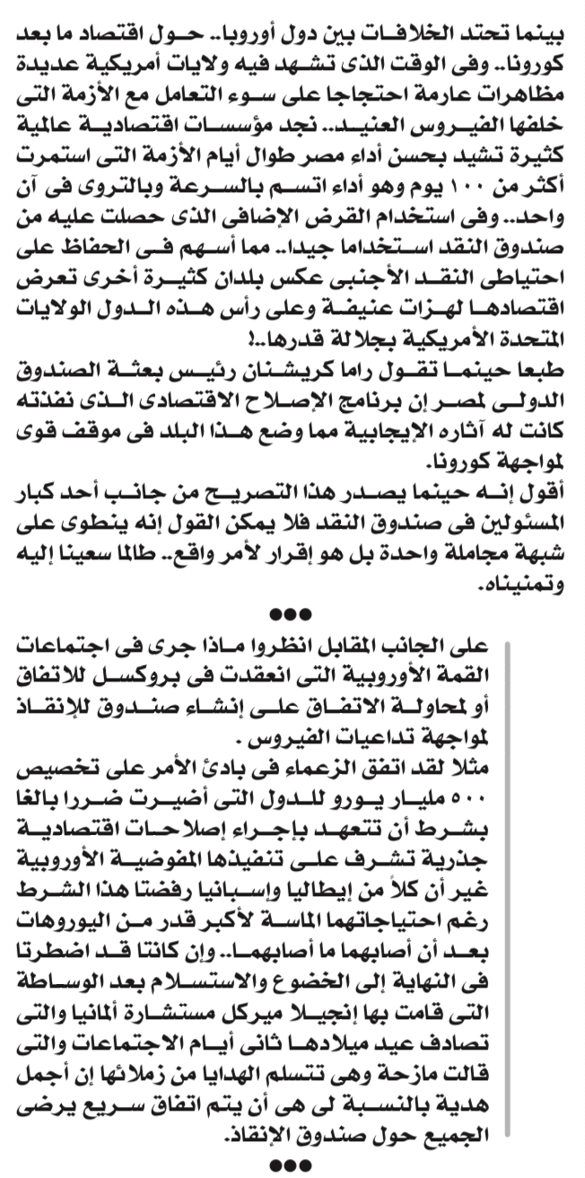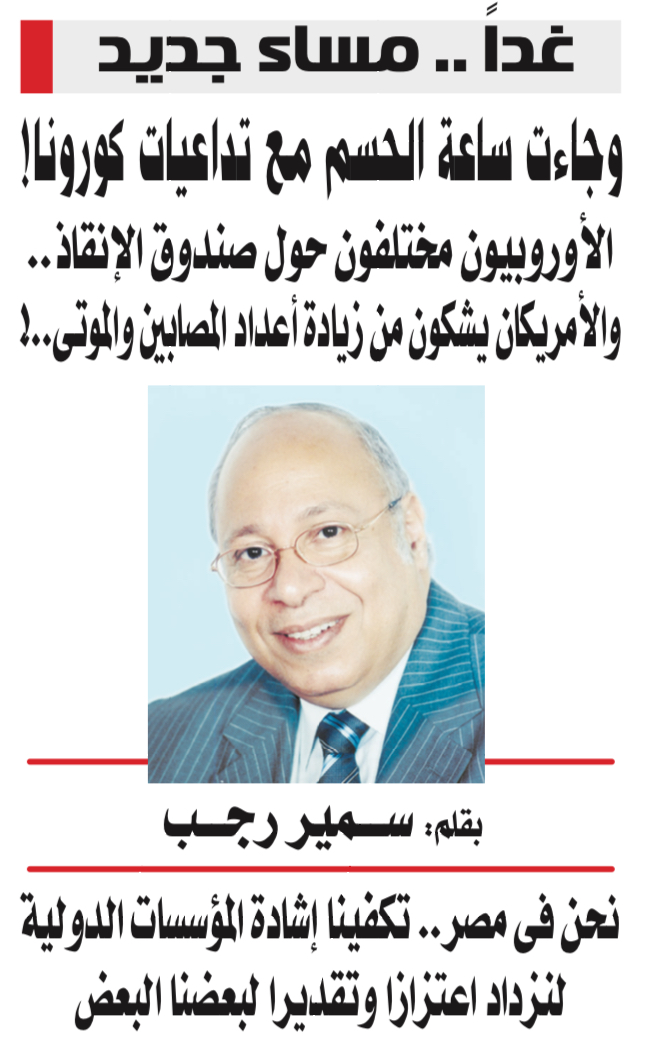 بينما تحتد الخلافات بين دول أوروبا.. حول اقتصاد ما بعد كورونا.. وفي الوقت الذي تشهد فيه ولايات أمريكية عديدة مظاهرات عارمة احتجاجا على سوء التعامل مع الأزمة التي خلفها الفيروس العنيد.. نجد مؤسسات اقتصادية عالمية كثيرة تشيد بحسن أداء مصر طوال أيام الأزمة التي استمرت أكثر من 100 يوم وهو أداء اتسم بالسرعة وبالتروي في آن واحد.. وفي استخدام القرض الإضافي الذي حصلت عليه من صندوق النقد استخداما جيدا.. مما أسهم في الحفاظ على احتياطي النقد الأجنبي عكس بلدان كثيرة أخرى تعرض اقتصادها لهزات عنيفة وعلى رأس هذه الدول الولايات المتحدة الأمريكية بجلالة قدرها..!
