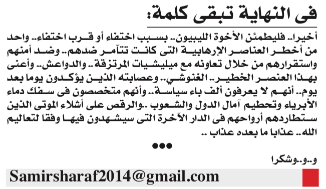 أخيرا.. فليطمئن الأخوة الليبيون.. بسبب اختفاء أو قرب اختفاء.. واحد من أخطر العناصر الإرهابية التي كانت تتآمر ضدهم.. وضد أمنهم واستقرارهم من خلال تعاونه مع ميليشيات المرتزقة.. والدواعش.. وأعني بهذا العنصر الخطير.. الغنوشي.. وعصابته الذين يؤكدون يوما بعد يوم.. أنهم لا يعرفون ألف باء سياسة.. وأنهم متخصصون في سفك دماء الأبرياء وتحطيم آمال الدول والشعوب ..والرقص على أشلاء الموتى الذين ستطاردهم أرواحهم في الدار الآخرة التي سيشهدون فيها وفقا لتعاليم الله.. عذابا ما بعده عذاب ..