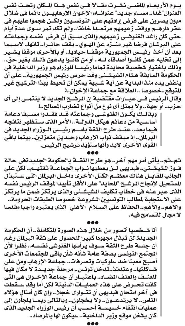 أنا شخصيا أتصور من خلال هذه الصورة المتكاملة.. أن الحكومة الجديدة لن تبذل مجهودا كبيرا للحصول على ثقة البرلمان رغم أن جلسة طرح الثقة سوف يرأسها الغنوشي نفسه.. نظرا لأن المجتمع التونسي بصفة عامة شأنه شأن باقي المجتمعات الأخرى أصبح معبئا ضد سلوكيات