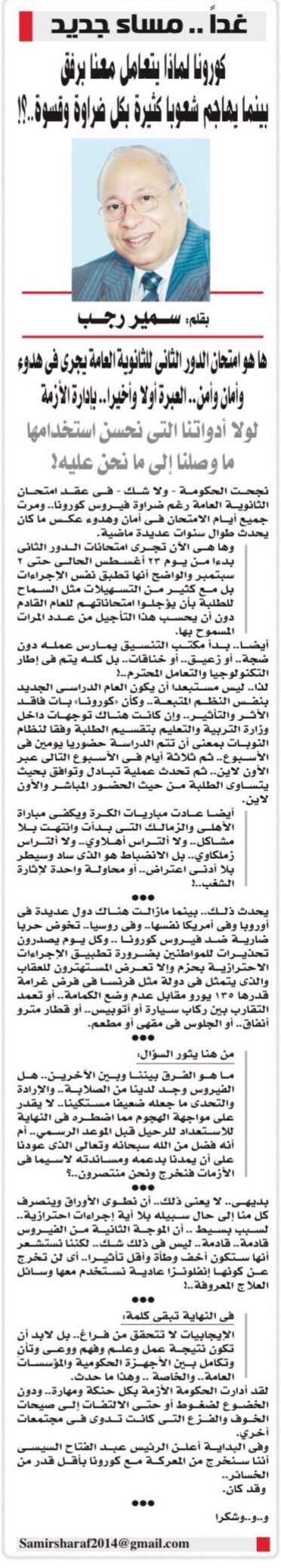 نجحت الحكومة -ولا شك-في عقد امتحان الثانوية العامة رغم ضراوة فيروس كورونا.. ومرت جميع أيام الامتحان في أمان وهدوء عكس ما كان يحدث طوال سنوات عديدة ماضية.