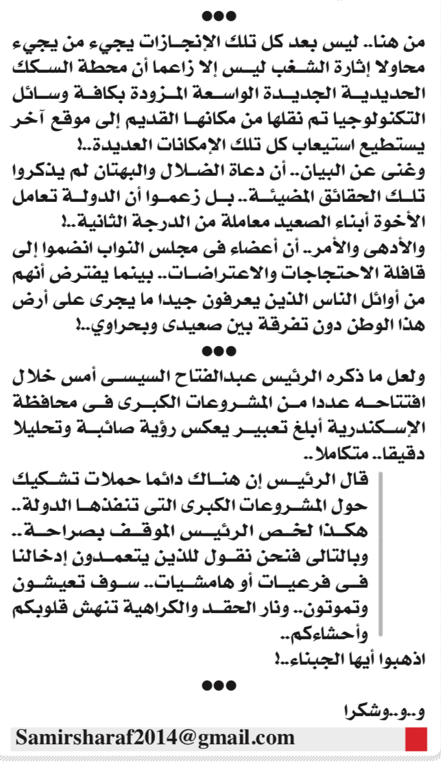 *حاولوا إثارة مشاعر الأخوة أهل الصعيد بادعاءات كاذبة ومغرضة وللأسف سار على نهجهم بعض أعضاء البرلمان