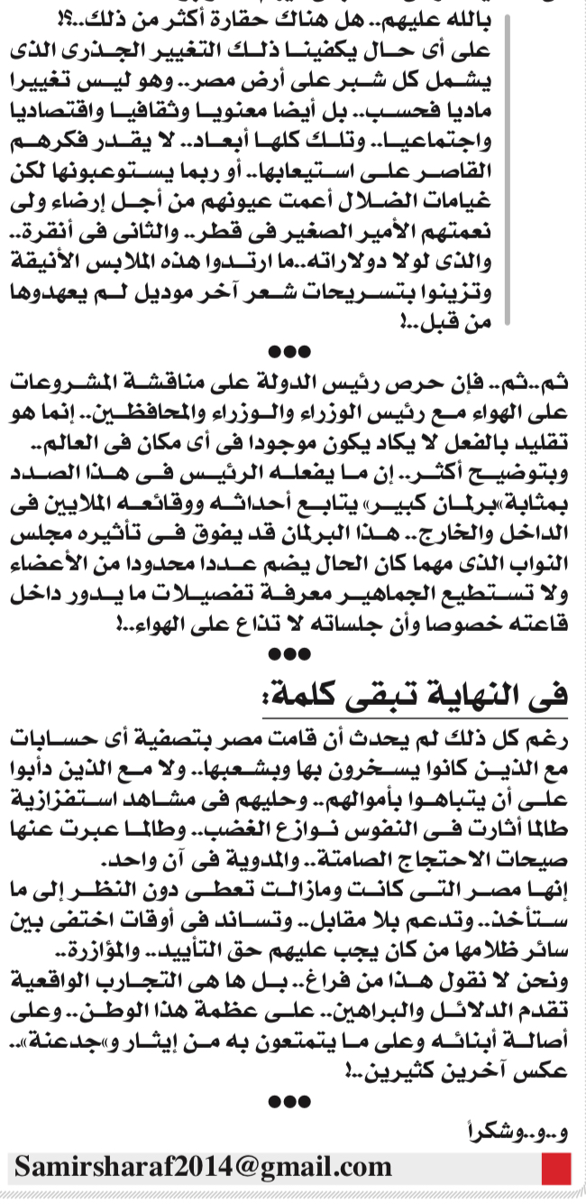 على أي حال يكفينا ذلك التغيير الجذري الذي يشمل كل شبر على أرض مصر.. وهو ليس تغييرا ماديا فحسب.. بل أيضا معنويا وثقافيا واقتصاديا واجتماعيا.. وتلك كلها أبعاد.. لا يقدر فكرهم القاصر على استيعابها.. أو ربما يستوعبونها لكن غيامات الضلال أعمت عيونهم من أجل إرضاء ولي نعمتهم الأمير الصغير في قطر.. والثاني في أنقرة.. والذي لولا دولاراته.. ما ارتدوا هذه الملابس الأنيقة وتزينوا بتسريحات شعر آخر موديل لم يعهدوها من قبل..!