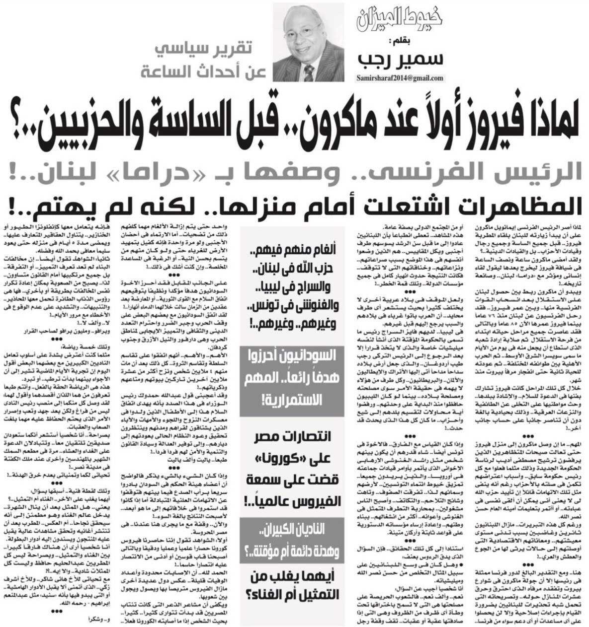 المهم.. ما أن وصل ماكرون إلى منزل فيروز حتى تعالت صيحاتالمتظاهرين الذين يرفضون ترشيح مصطفى أديب لرئاسة الحكومة الجديدة وذلك مثلما فعلوا مع كل رئيس حكومة سابق.. وأسباب اعتراضهم تكمن في صلته بالأحزاب رغم أنهينفي مثل تلك الاتهامات قائلا إن تأييد حزب الله لي لا يعني أني يمكن أن ألقى نفسي في عباءته.. أو أئتمر بتعليمات أمينه العام حسن نصر الله.