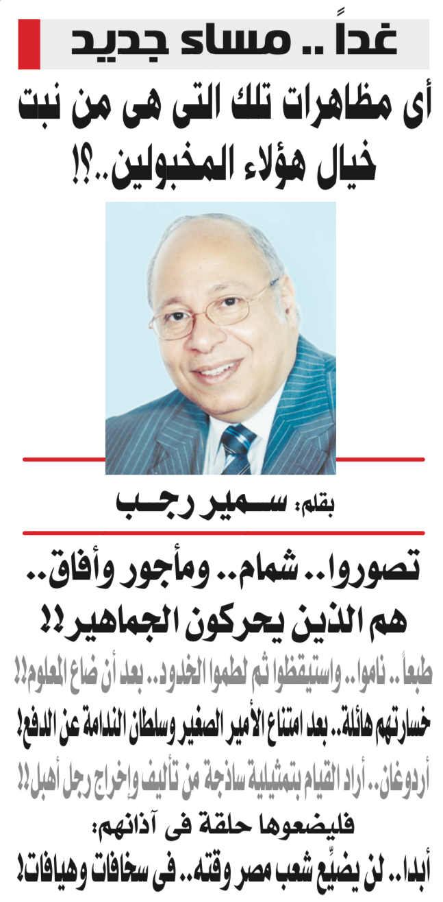 من هنا عندما يلتقي شمام مع مأجور مع أفاق ليهيئ لهم خيالهم القيام بمظاهرات لإسقاط الدولة فإن المصريين عن بكرة أبيهم لابد أن ينظروا إلى أمثال هؤلاء ثم يدوسونهم بالأقدام لا لشيء إلا لمجرد تجرؤهم على أن يقرنوا أسماءهم العفنة باسم الوطن الغالي الذي يحظى بسمعة عالمية رائقة المستوى..