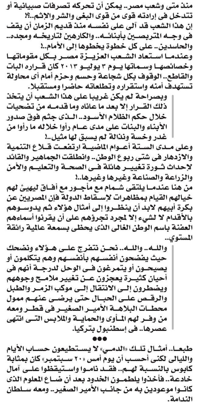 طبعا.. أمثال تلك "الدمى" لا يستطيعون حساب الأيام والليالي لكني أحسب أن يوم أمس (20 سبتمبر) كان بمثابة كابوس بالنسبة لهم.. فقد ناموا واستيقظوا على آمال خادعة.. فأخذوا يلطمون الخدود بعد أن ضاع المعلوم الذي كانوا موعودين به من جانب الأمير الصغير.. ومعه سلطان الندامة.