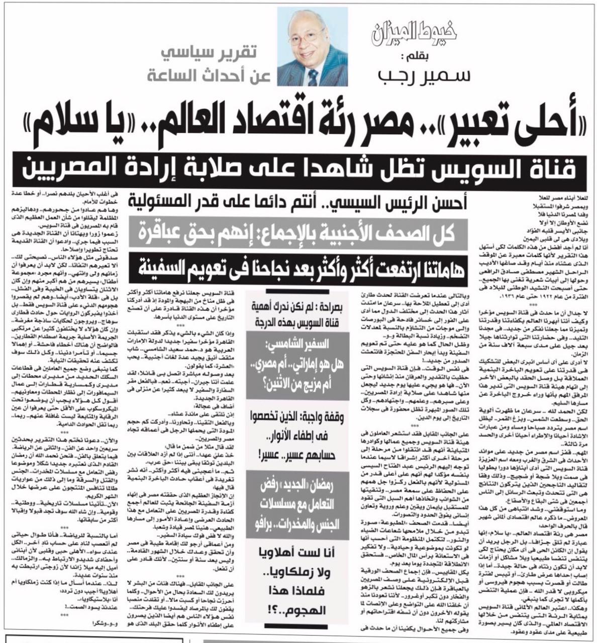 المهم.. قفز اسم مصر من جديد على موائد الأحداث في الشرق والغرب ومعه اسم العزيزة قناة السويس التي أدى أبناؤها دورا بطوليا في صمت وبلا ضجة أو ضجيج.. وذلك وفقا لتقاليد الناجحين الذين يتركون النتائج هي التي تتحدث وتبعث الرسائل إلى الناس أجمعين في شتى البقاع والأصقاع.