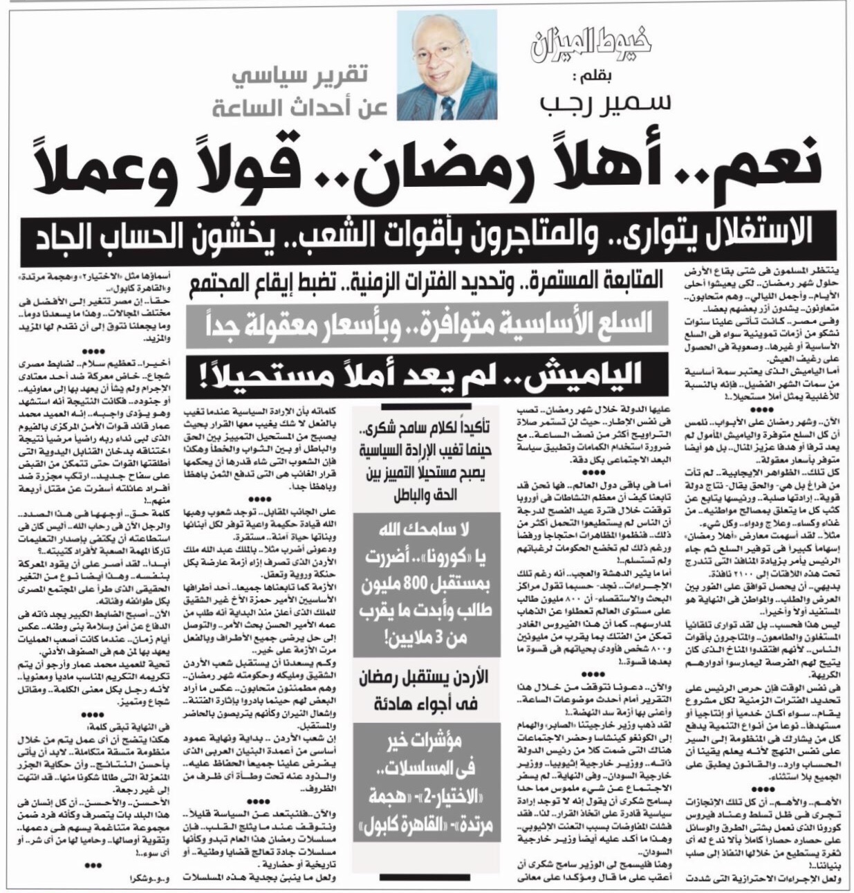 وكم يسعدنا أن يستقبل شعب الأردن الشقيق ومليكه وحكومته شهر رمضان.. وهم مطمئنون متحابون.. عكس ما أراد البعض لهم حينما بادروا بإثارة الفتنة.. وإشعال النيران وكأنهم يتربصون بالحاضر والمستقبل.