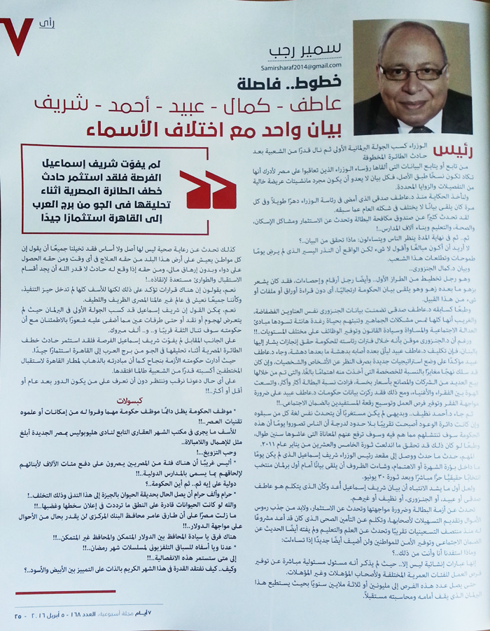 سمير رجب يكتب خطوط فاصلة وكبسولات بمجلة 7 أيام بتاريخ 5 ابريل 2016