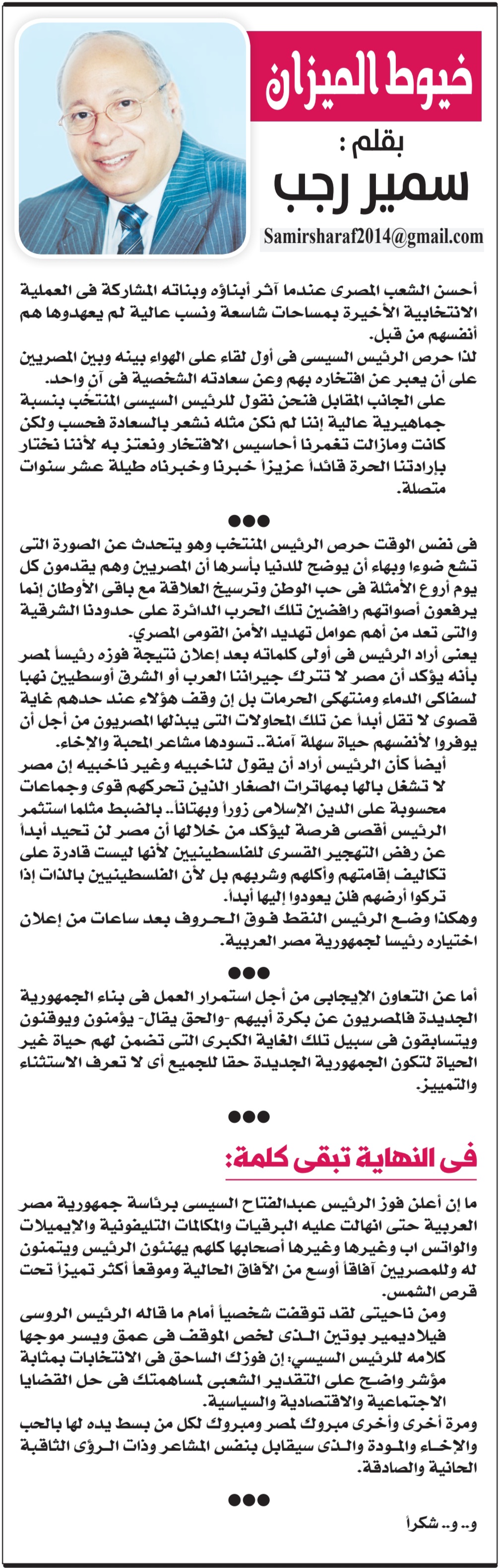 ومن ناحيتي لقد توقفت شخصيا أمام ما قاله الرئيس الروسي فيلاديمير بوتين الذي لخص الموقف في عمق ويسر موجها كلامه للرئيس السيسي: إن فوزك الساحق في الانتخابات بمثابة مؤشر واضح على التقدير الشعبي لمساهمتك في حل القضايا الاجتماعية والاقتصادية والسياسية..