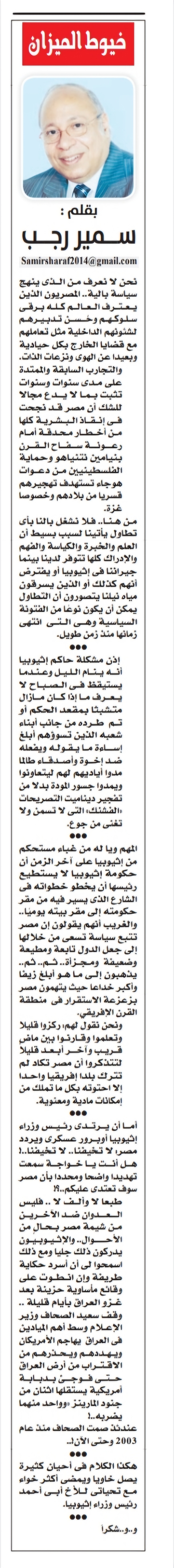 أما أن يرتدي رئيس وزراء إثيوبيا أوبرور عسكري ويردد مصر: لا تخيفنا .. لا تخيفنا..! هل أنت يا خواجة سمعت تهديدا واضحا ومحددا بأن مصر سوف تعتدي عليكم.. ؟!