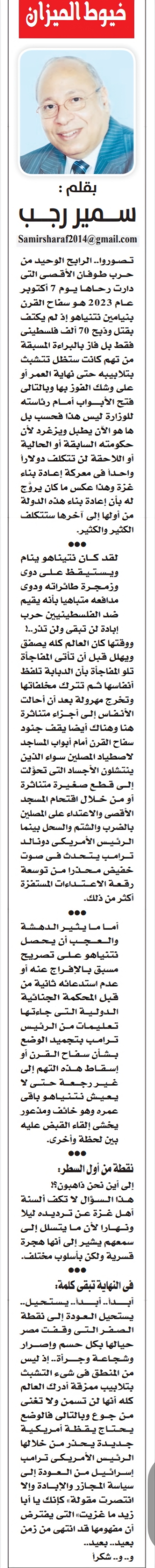 تصوروا.. الرابح الوحيد من حرب طوفان الأقصى التي دارت رحاها يوم 7 أكتوبر عام 2023 هو سفاح القرن بنيامين نتنياهو إذ لم يكتف بقتل وذبح 70 ألف فلسطيني فقط بل فاز بالبراءة المسبقة من تهم كانت ستظل تتشبث بتلابيبه حتى نهاية العمر أو على وشك الفوز بها وبالتالي فتح الأبواب أمام رئاسته للوزارة ليس هذا فحسب بل ها هو الآن يطبل ويزغرد لأن حكومته السابقة أو الحالية أو اللاحقة لن تتكلف دولارا واحدا في معركة إعادة بناء غزة وهذا عكس ما كان يروج له بأن إعادة بناء هذه الدولة من أولها إلى آخرها ستتكلف الكثير والكثير.