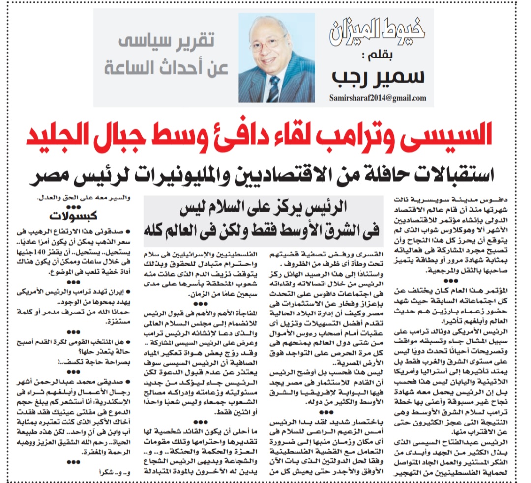 واستنادا إلى هذا الرصيد الهائل ركز الرئيس من خلال اتصالاته ولقاءاته في اجتماعات دافوس على التحدث بإعزاز وفخار عن الاستثمارات في مصر وكيف أن إدارة البلاد الحالية تقدم أفضل التسهيلات وتزيل أي عقبات أمام أصحاب رؤوس الأموال من شتى دول العالم بمنحهم في كل مرة الحرص على التواجد فوق الأرض المصرية..